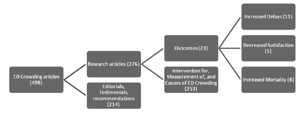 Molti studi erano su popolazioni ampie provenienti da numerosi ospedali. Gli outcome correlati alla qualità dell’assistenza includono: il ritardo nella somministrazione antibiotica o del controllo del dolore, quello relative agli interventi cardiovascolari, la diminuzione della soddisfazione del paziente e l’aumento della mortalità. I 23 articoli di ricerca esaminati associano gli outcome con l’affollamento del DEA e raggruppano le problematiche in tre categorie: